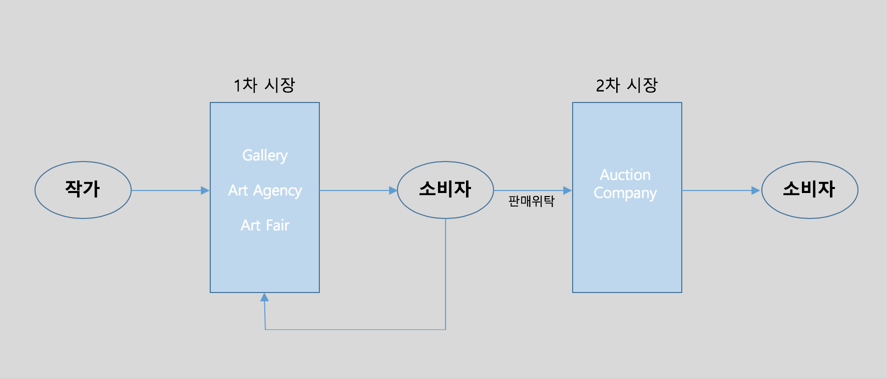 앞서 설명한 것처럼, 소비자가 갤러리나 아트 에이전트를 통해 직접 구매하거나 아트페어에서 구매하는 시장을 1차 시장(Primary Market)이라고 합니다. 작품을 구매한 소비자는 이를 resell할 수가 있는데, 대표적인 케이스가 경매회사에 판매위탁을 하는 방법입니다. 소비자에게 콜렉팅 된 작품이 다시 경매시장에 나와서 다른 소비자에게 팔린다는 것은 그 작품을 찾는 수요가 형성되었다는 것을 의미합니다. 작가의 손을 떠나 소비자에게 한번 팔린 작품이 재거래되는 시장을 2차 시장(Secondary Market)이라고 지칭합니다.