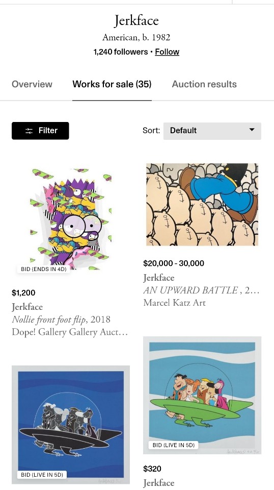 마찬가지로 Jerkface를 한 번 검색해 보겠습니다. 이 작가는 현재 랭킹이 164,237등이네요. 전시회는 2016년에 홍콩 Influential이라는 Exhibition에 한 번 참여 한게 전부이네요. 소속 갤러리는 뉴욕 소재의 Padre Gallery이네요. 이제 막 핫해지기 시작한 작가인 듯 합니다.