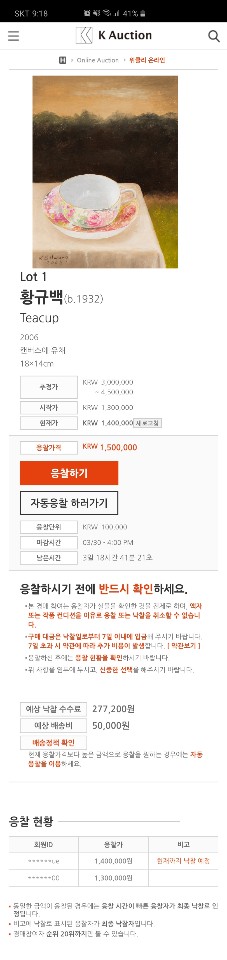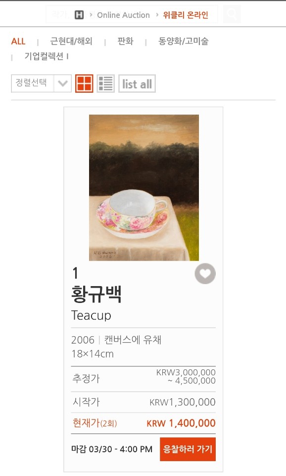 작가명, 작품명, 작품 사이즈, 추정가, 시작가 와 현재가가 보이죠. 황규백의 'Teacup'이라는 작품은 추정가가 300만원~400만원이네요. 시작가는 130만원부터인데 현재까지 2번의 응찰이 있어서 현재가는 140만원이군요.