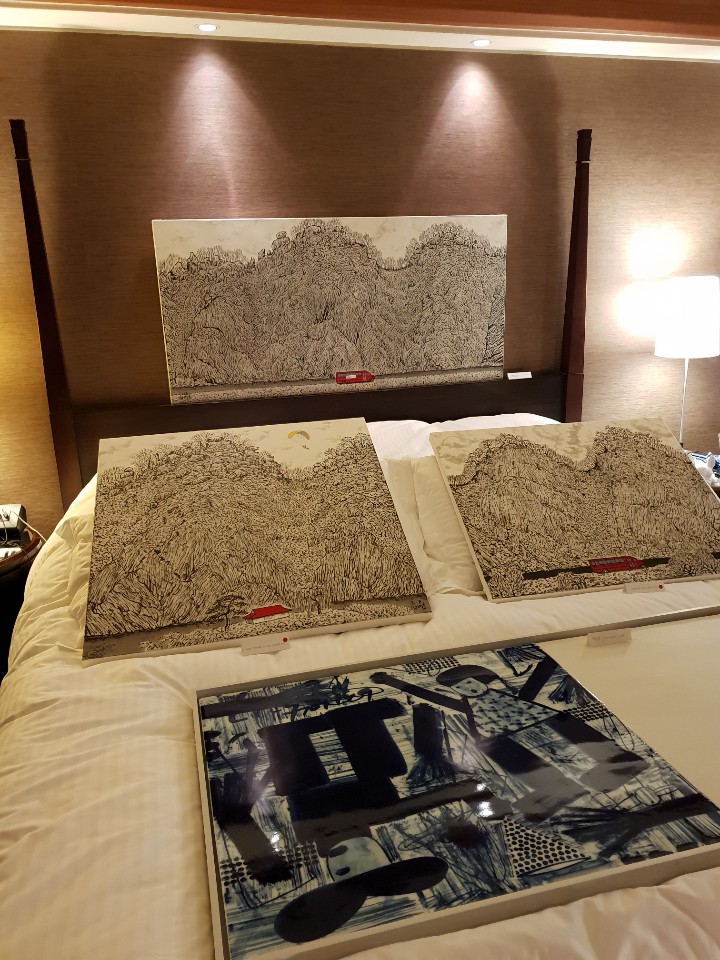 아트페어의 높은 천장과 흰 벽에 걸린 작품보다는 다소 어두운 호텔 객실에 적절한 하이라이트 조명을 보태서 걸린 작품들이 주목도도 더 높은 것 같구요. 작품을 집에 걸었을 때 어떤 느낌일지 상상하기도 쉬운 것 같아요.