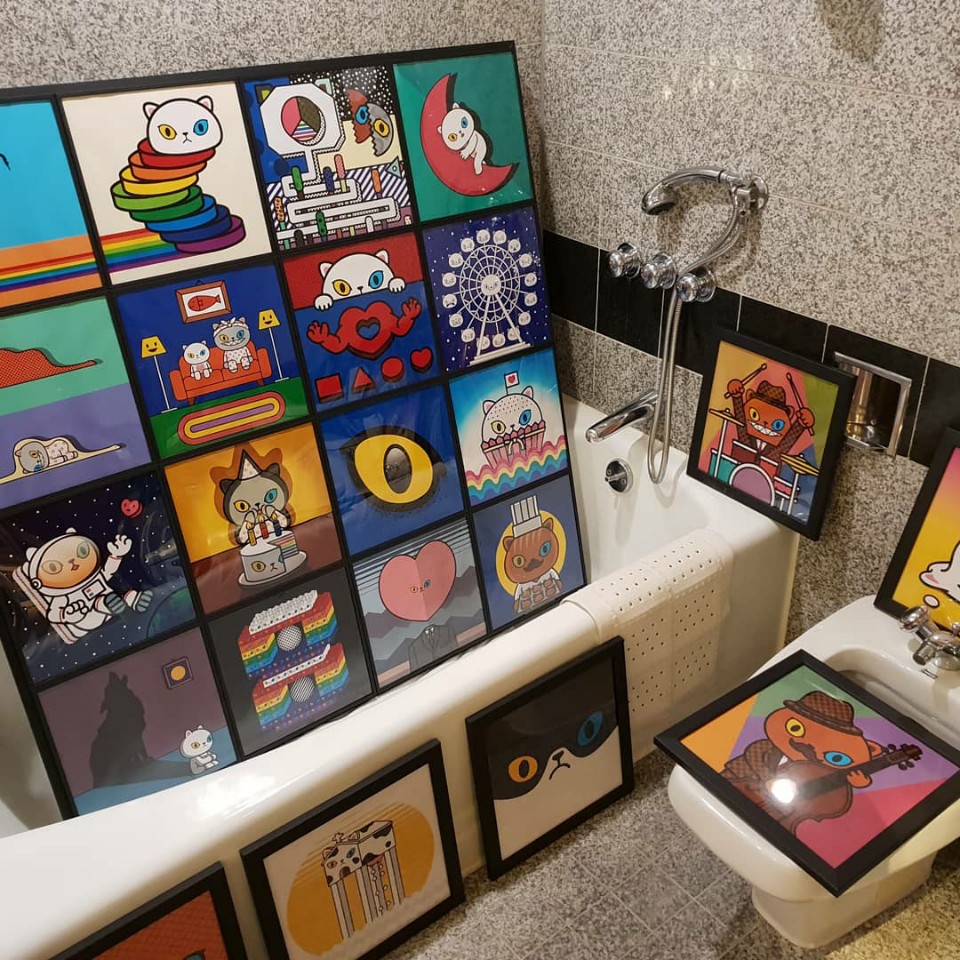 아래처럼 침대위에 미술작품들이 전시되어 있답니다. 재밌죠?