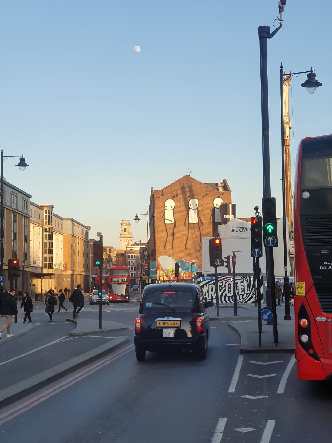 위 사진은 런던여행 중 구글맵에 표시해둔 스틱 벽화장소를 지나가는 버스안에서 스틱의 작품을 보며 찍은 사진이다.