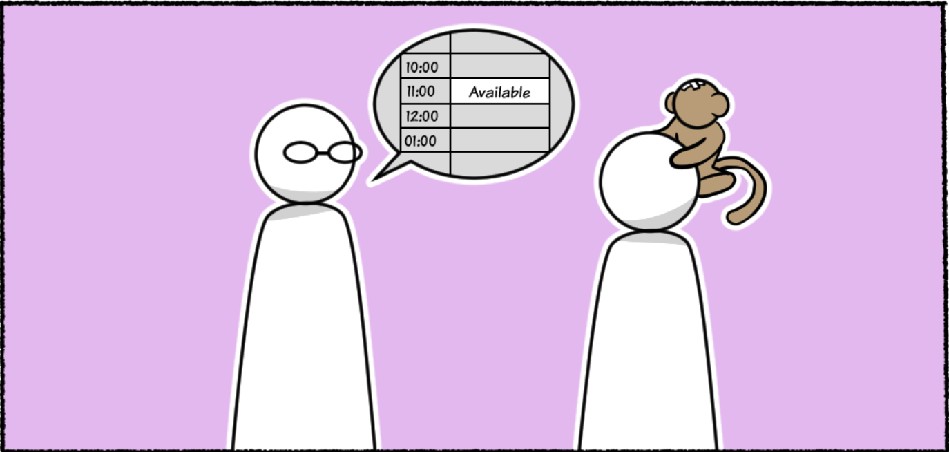 이 아티클은 만약 팀장이 즉답을 못할 환경인 경우에는, 해당 어젠더와 관련해서 미팅 스케쥴을 잡을 것을 권고한다. 이 경우 원숭이는 여전히 팀원의 어깨에 매달려 있고, 미팅때까지 원숭이를 스스로 돌봐야 한다는 점이 다르다.