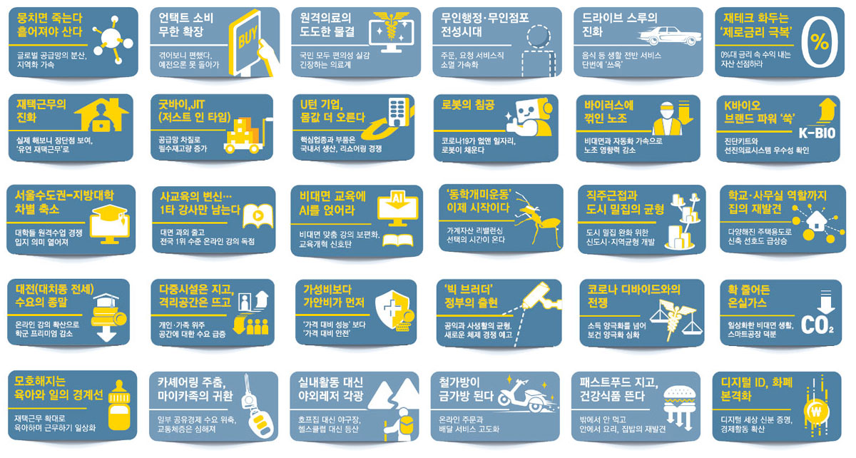 `코로나 이전(Before Corona, BC)`과 `코로나 이후(After Corona, AC)`를 `기원 전(BC)`과 `기원 후(AC)`로 빚대어 얘기할 정도로 충격파를 크게 보는 미래학자도 많다. `컨택트`로 이뤄졌던 삶의 방식을 `언택트`로 바꿔야 하는 만큼 그 변화의 모습은 상상하기 어려울 정도다.