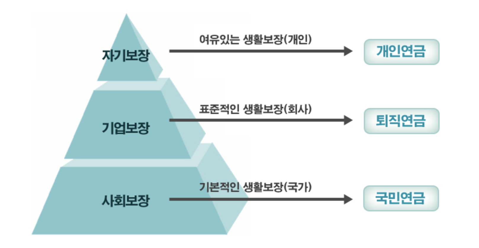 우리나라 연금 체계는 3층 구조다. 1층은 공적연금제도로 국민연금, 특수직연금(공무원연금.사학연금.군인연금 등). 기초연금 등이 있다. 2층은 기업에서 보장하는 퇴직연금(퇴직금). 3층은개인이 알아서 준비하는 개인연금이다. 보통 1층의 공적연금은 최지생활비, 2층의 퇴직연금은 필요 생활비. 3층의 개인연금은 여유 생활비로 분류하는데 이것은 이론일 뿐 개인마다 천차만별이다.