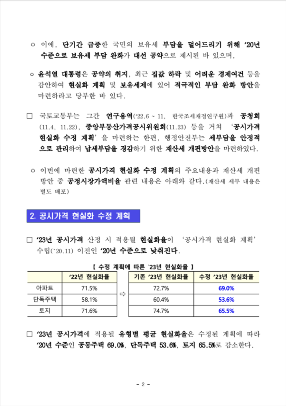 재산세 합산 금액이 1~2주택자는 150%, 조정대상지역 2~3주택 이상자는 300% 초과분에 대한 과세를 제외했으나, 상한율을 일괄적으로 150%로 낮춘다.