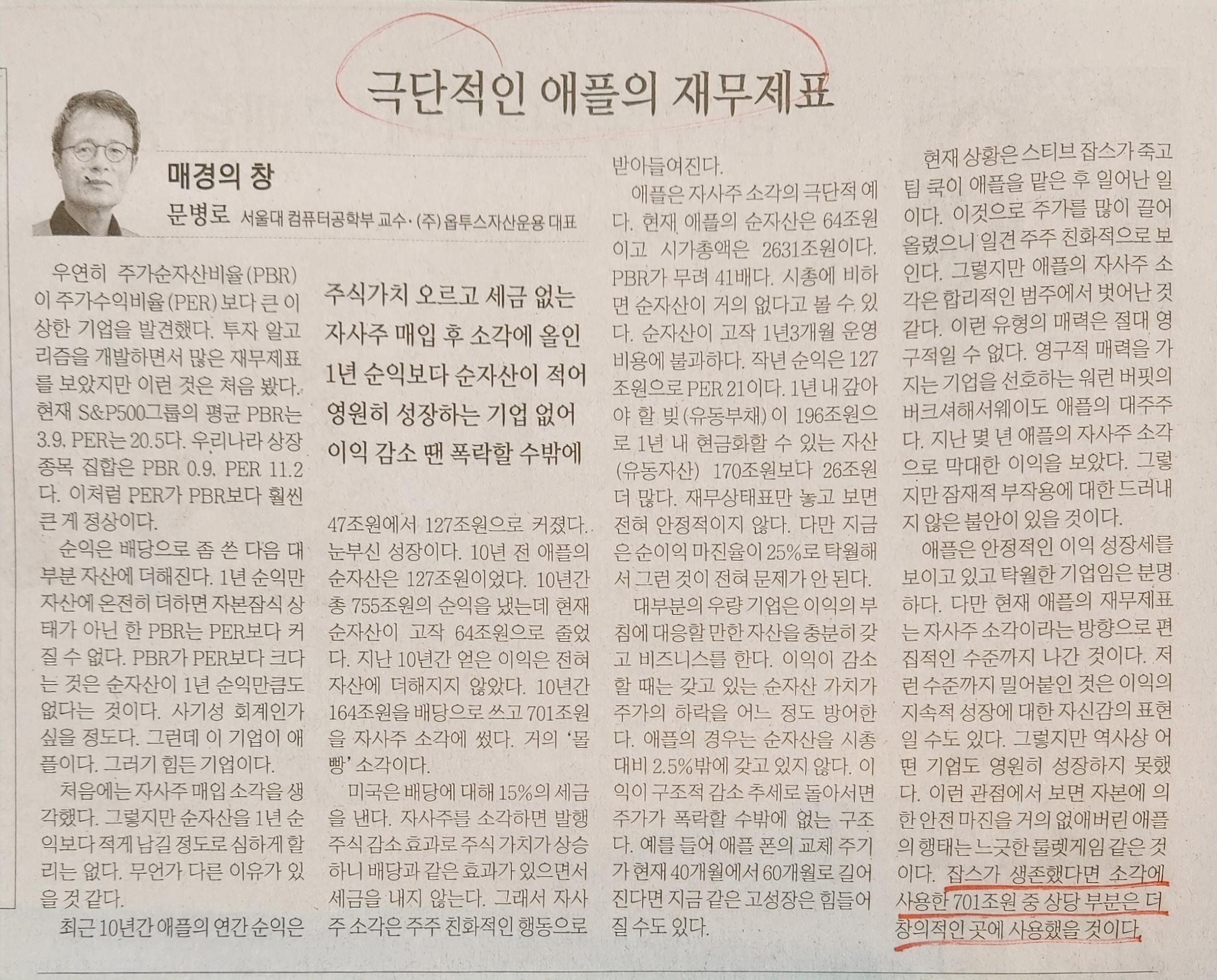 애플은 안정적인 이익 성장세를 보이고 있고 탁월한 기업임은 분명하다. 다만 현재 애플의 재무제표는 자사주 소각이라는 방향으로 편집적인 수준까지 나간 것이다. 저런 수준까지 밀어붙인 것은 이익의 지속적 성장에 대한 자신감의 표현일 수도 있다. 그렇지만 역사상 어떤 기업도 영원히 성장하지 못했다. 이런 관점에서 보면 자본에 의한 안전 마진을 거의 없애버린 애플의 행태는 느긋한 룰렛게임 같은 것이다. 잡스가 생존했다면 소각에 사용한 701조원 중 상당 부분은 더 창의적인 곳에 사용했을 것이다.