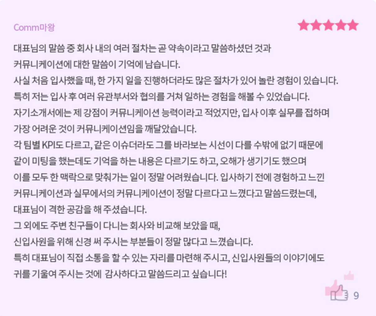 "자기소개서에 '저는 소통의 대가입니다'라고 적었답니다. 그런데 직장생활을 해보니 말을 잘하거나 글을 잘 쓴다고 소통의 대가가 되는건 아니더라구요. 제가 말을 잘 하는게 중요한게 아니라 듣는 분들이 잘 이해할 수 있도록 전달했느냐가 정말 중요하단 것을 배웠습니다."